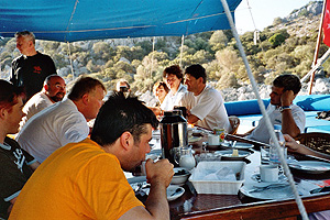 Und trotz all dieser Unannehmlichkeiten war es eine tolle Reise. Wenn die einzige Anstrengung darin besteht, vom Frühstückstisch zum Vorderdeck zu krabbeln um sich die Sonne auf den Bauch scheinen zu lassen, und nach dem Tauchgang sich aus dem Anzug zu schälen, um die Butterkekse und den feinen, heißen türkischen Tee zu genießen, dann ist das per se schon Erholung pur.