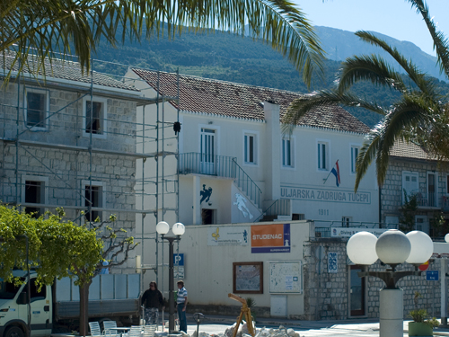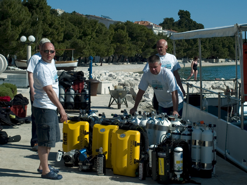 Die Basis wird vom Deutschen Sebastian und seiner Frau Maja geführt und liegt direkt im Yachthafen von Tucepi. Dort sind genügend Parkplätze direkt an der Uferpromenade vorhanden - zumindest jetzt in der Vorsaison-Zeit, und so waren für uns kurze Wege garantiert. Bereits am Anreiseabend konnten wir noch den Checkin auf der Basis machen; es wurde der Papierkram erledigt, die Logbücher und die tauchärztliche Untersuchung geprüft, und die Einweisung in die Abläufe der Basis gegeben. Wegen möglicher Kontrollen durch die Küstenwache achtet Sebastian streng darauf, dass am Morgen vor der Abfahrt des Tauchbootes eine Liste der gemeldeten Tauchgäste vorbereitet werden kann - Anmeldungen zum Tauchen sollten daher zuverlässig am Vorabend erfolgen.
