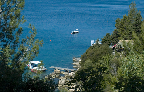 Vom Ufer führt ein Holzsteg über große Felsbrocken in die Bucht. Dort ist - je nach Windlage - das Motorboot, oder zumindest das Schlauchboot vertäut. Bei ruhigem Wetter stiegen wir direkt vom Steg ins Boot, sonst musste der Umweg über das Zodiak genommen werden - auch kein Problem.