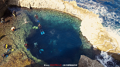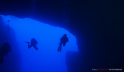 Aber wer zum Tauchen nach Gozo kommt, der kommt ja doch meist für die Höhlen, Kamine, Spalten, Tunnel ... hinein ins Dunkel und wieder raus ins helle unendliche Blau, wo majestätisch Dutzende von Makrelen ihre Kreise ziehen, Brassen in Schwärmen die Felsen hinauf und hinab wuseln und Tausende von kleinen Mönchsfischen einen umkreisen. Die Unterwasserwelten bieten atmosphärische Eindrücke, die ich nicht vergessen werde - ob das nun die hin-und her wogenden Seegrasebenen von Hondoq Reef waren, die schon fast psychedelisch wirkten, die schier unnatürlich anmutenden blauen Spiegelungen in der Cathedral Cave oder das Gefühl zu Fliegen, beim Raustauchen unter dem Azur Window und sich auf den Rücken legen und nach oben blicken, wo die Brandung gegen die Felsen schlägt.