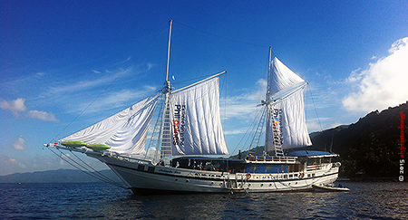 Das Schiff ist im „traditionellen indonesischen Stil eines Phinisi-Schoners“ gebaut und mit 40 m Länge recht eindrucksvoll. Es ist ein wirklich schönes, großes Schiff, auf dem sich die Gäste der 8 Kabinen auf dem Sonnendeck, dem Tauchdeck, dem Speisebereich am Heck oder auch im luxuriösen Salon gesellig zusammenfinden oder auch mal aus dem Weg gehen können, je nach Gusto. Die Kabinen sind außerordentlich komfortabel ausgestattet, jeweils mit eigener Klimaanlage, aber auch mit eigenem Monitor und Videothek für die nicht aufkommende Langeweile. Die Bäder verfügen jeweils über einen großen Duschbereich mit Haartrockner. Die Handtücher wurden jeden 3. Tag gewechselt, so dass stets weiche, salzfreie Frotteetücher zur Verfügung standen. Das Duschwasser war heiß – richtig heiß … wenn man wollte.