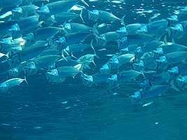 Und noch ganz benommen von diesem Schauspiel wartet schon das nächste auf uns: Eine Schule Großmaulmakrelen kommt auf uns zu die Mäuler weit offen pflügen sie synchron durchs Wasser und glitzern silbrig, während sie knapp unter der Wasseroberfläche auf Frühstücksjagd sind. Sie lassen sich auch nicht beirren, als wir direkt in sie hineintauchen: Dicht schwimmen sie im Kreis um uns herum und ziehen dann weiter.