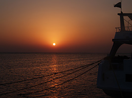 Nach dem Umziehen unten am Steg steigen wir über die Edelstahlleiter vorsichtig ins Wasser die Sonne kam gerade über den Horizont. Direkt am Einstieg geht es im Schein unserer Lampen um einige Korallenblöcke herum unter den noch ruhig ankernden Tagesbooten einige Meter steil nach unten; wir tauchen dann links weg. Die Unterwasserlandschaft ist kaum eintönig zu nennen: Korallenblöcke stehen einzeln oder in größeren Gruppen, unterbrochen von weitläufigen Sandflächen bis auf 20 m geht es bergab.