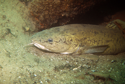 Langsam gingen wir direkt an der Wand nach unten und erreichten an dieser Stelle den Grund auf knapp 20m. Und dort - gut zu erkennen - steckte eine gewaltige Aalrutte in einer Höhle, nur Kopf und Vorderkörper schauten heraus. Sie wirkte ein wenig genervt ob der Störung, denn dass wir uns dieses herrliche Fotomotiv nicht entgehen haben lassen, ist klar. Immer wieder umkreisten wir das Tier, um die beste Fotoposition zu finden, gelangweilt blieb die Quappe liegen - sie dachte sich wohl auch, dass es uns bald zu kalt werden würde und sie endlich wieder ihre Ruhe bekommen würde.